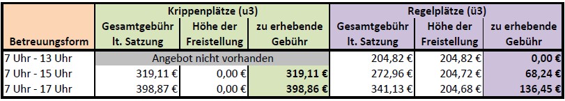 Der in der Spalte "zu erhebende Gebühr" angegebene Betrag ist von den Eltern mtl. einzuziehen.
